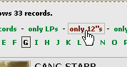 | 2. Choose the desired record format (All formats, LP's only, 12"s only, 7"s only) and browse from 0-Z. |