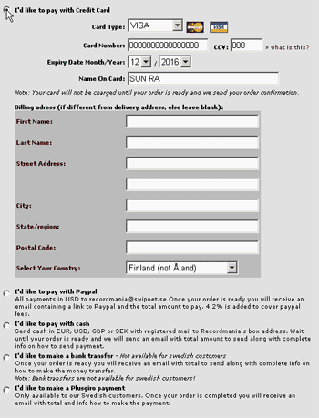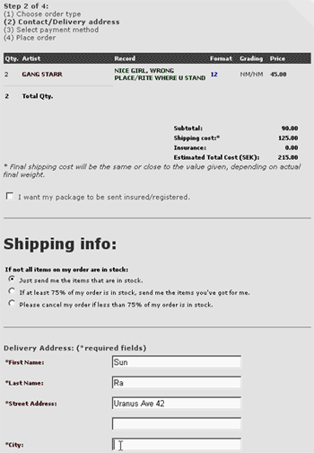 8. If you want your records sent insured, select the insurance box. Insurance is 60-150 SEK depending on total value and quantity of records. Let me know how you want me to handle your order if some of the records were already sold. Select the appropriate option. Fill out your delivery address. For special requests, shipping, trade offers etc, use the comment box. |