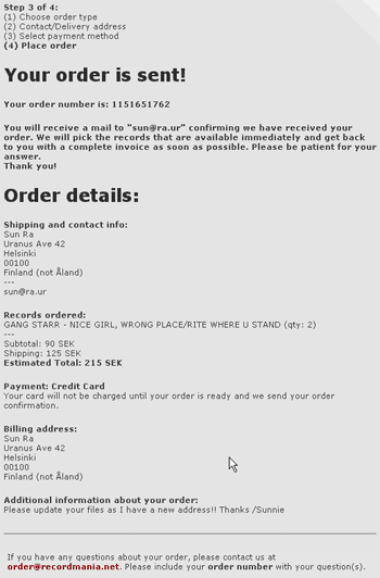 Ordering from Record Mania is very easy, just follow the shopping cart step-by-step;